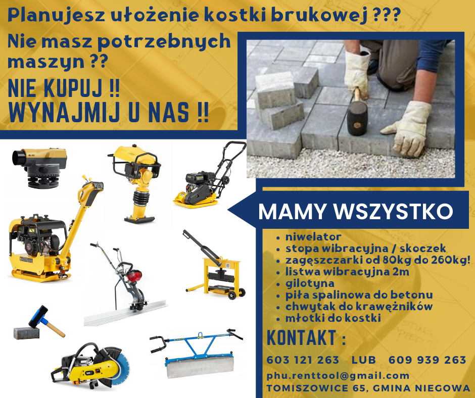 Planujesz ułożenie kostki brukowej?Nie masz potrzebnych maszyn? Nie kupuj! Wynajmij u nas!